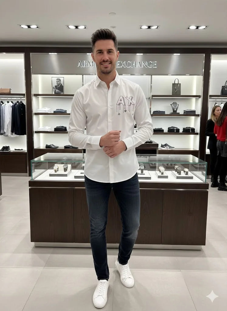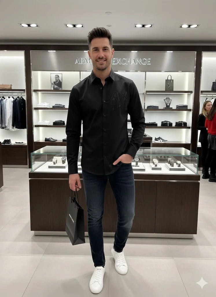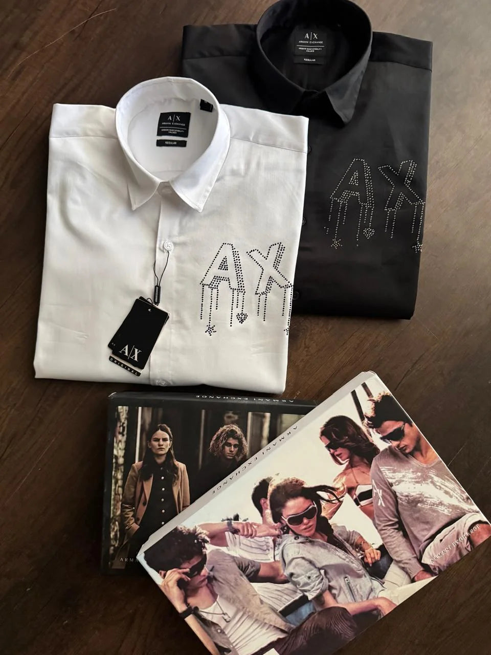 Elevate your evening wardrobe with this sophisticated Arm*ni Exch*nge Men’s Shirt. Designed for the modern man, this piece features a sleek slim-fit silhouette crafted from premium, breathable cotton for all-day comfort. The standout detail is the iconic AX logo on the chest, meticulously rendered in tonal studs with a unique "dripping" effect that catches the light perfectly.