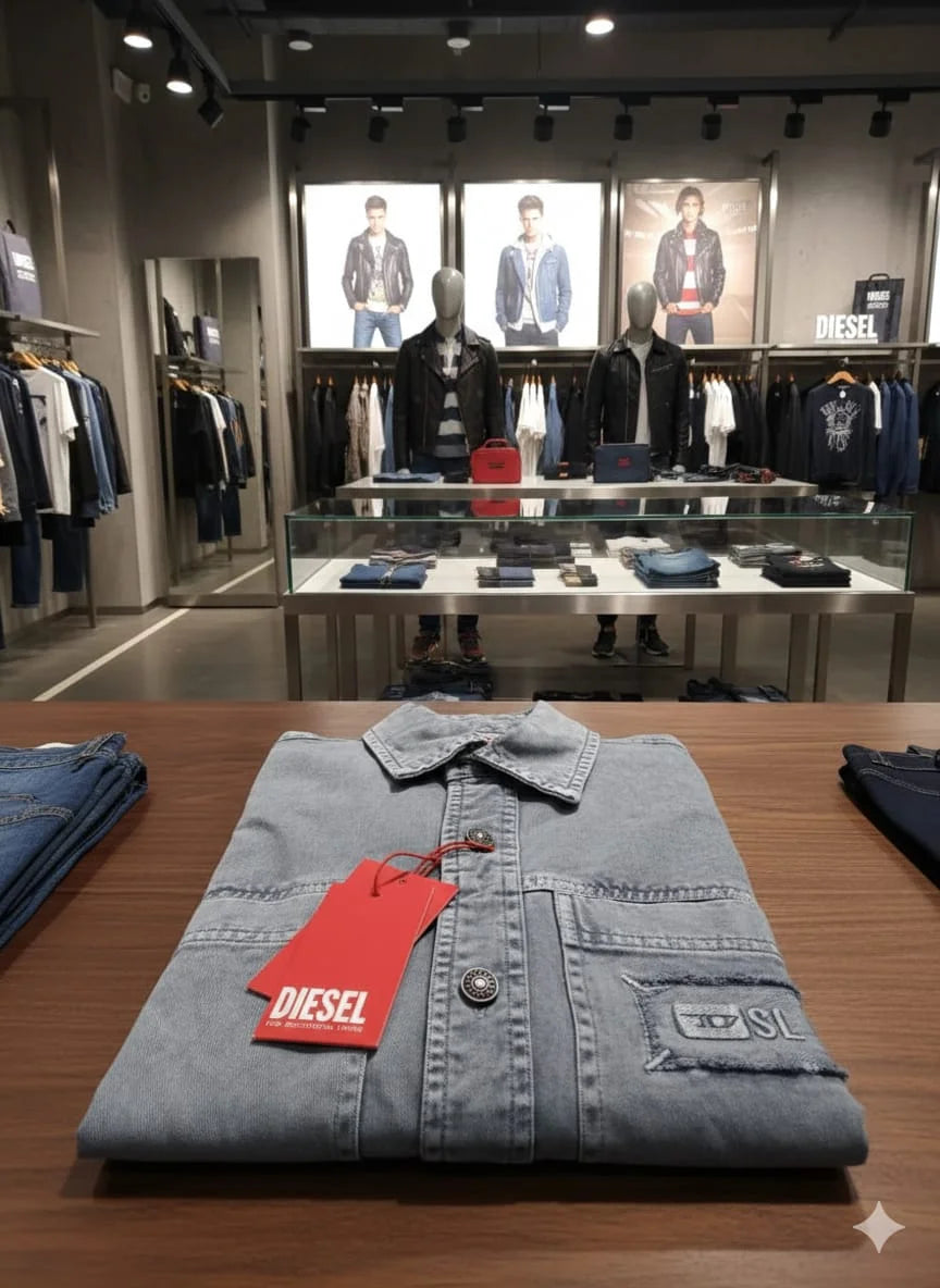 Hardware: Custom Diesel-branded metal buttons for an industrial touch.