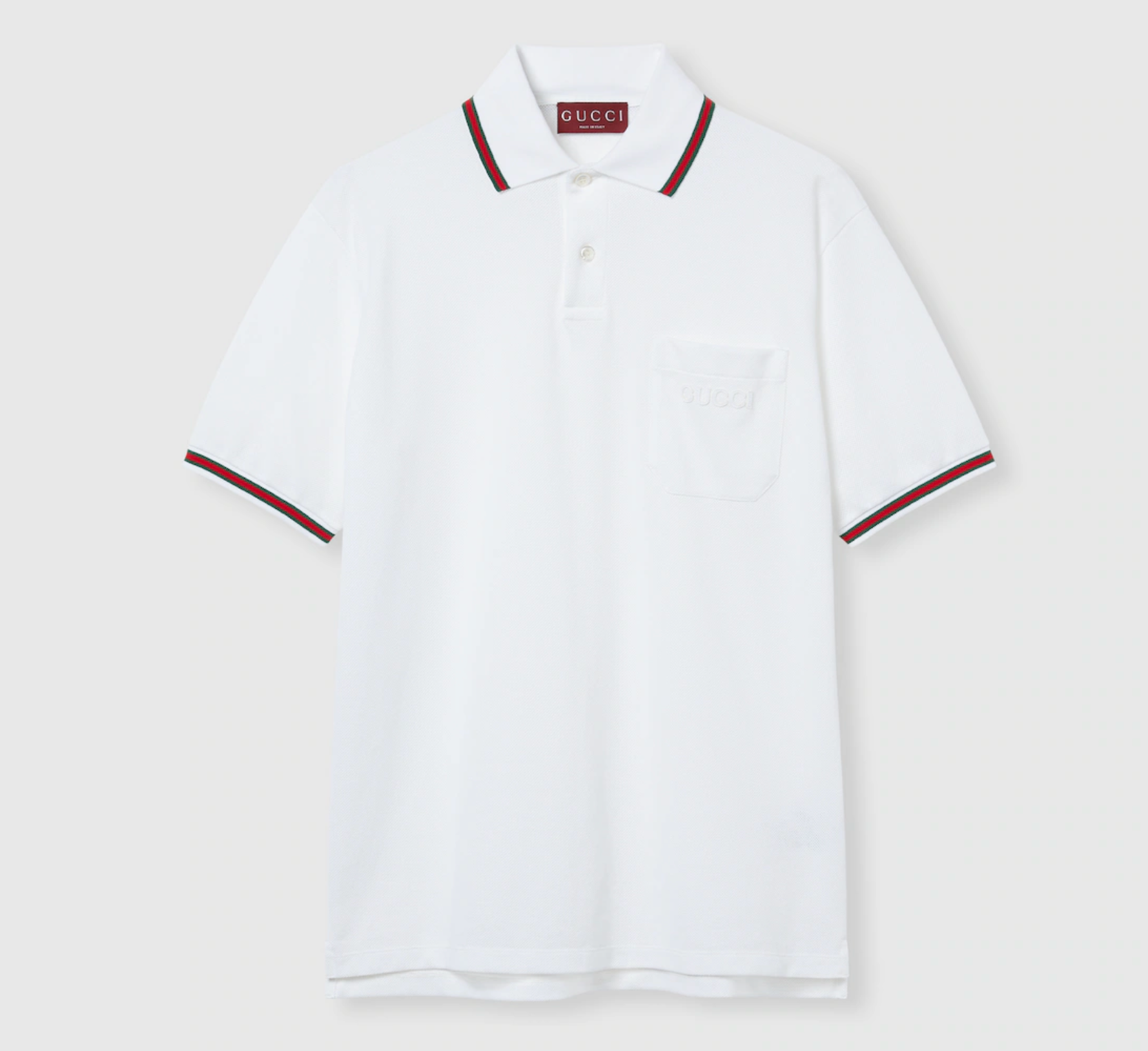 Featuring a crisp white base, the polo is defined by the signature Green and Red Web stripe accenting the collar and sleeve cuffs. A functional chest pocket is subtly finished with tonal "GUCCI" embroidery, offering a sophisticated, understated branding. The slim yet comfortable fit makes it a versatile staple for both high-end leisure and smart-casual ensembles.