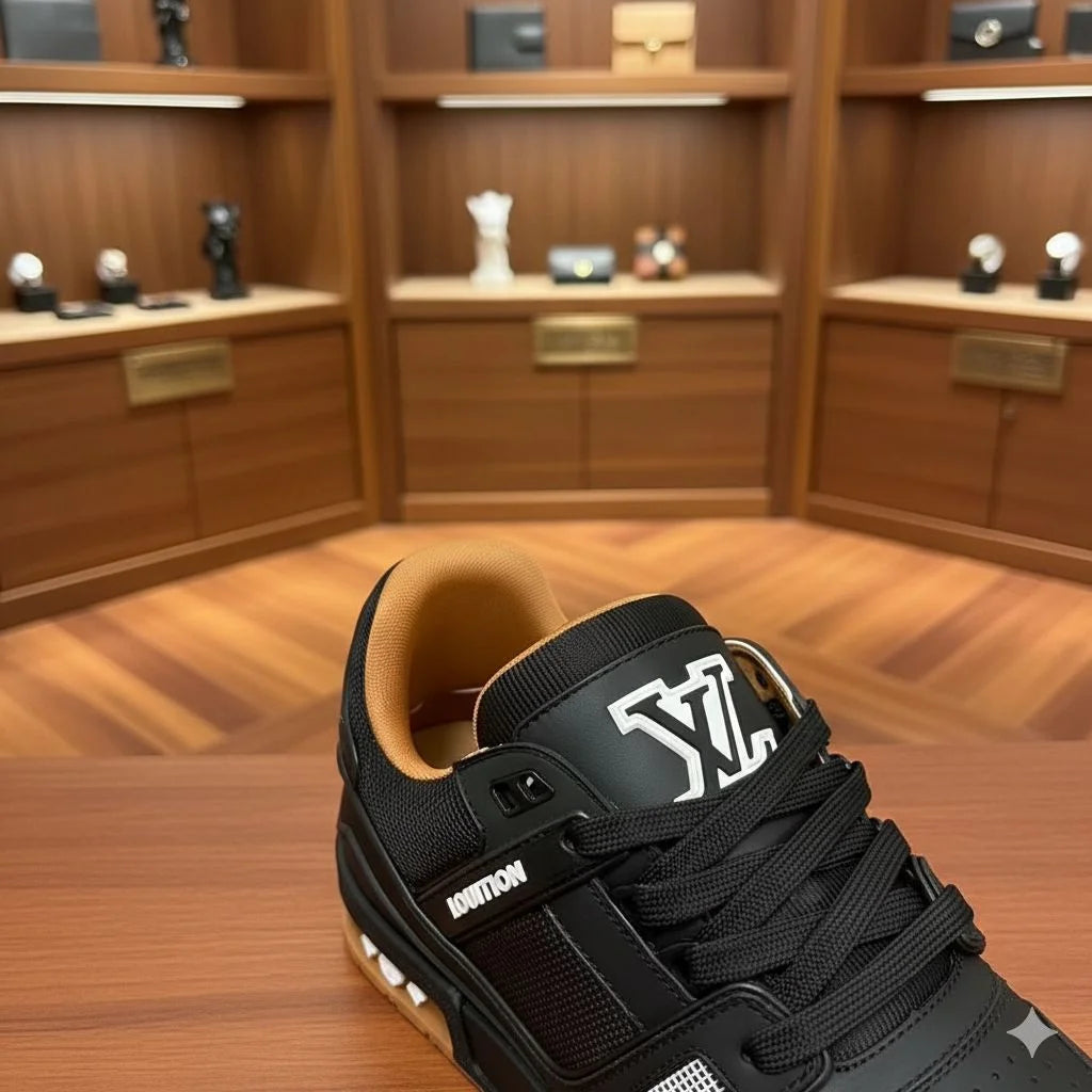 Iconic Branding: The tongue prominently displays the LV Initials, while the "Vuitton" signature is showcased on the side lace-guard.