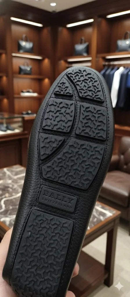 Step into bold sophistication with these Bally moccasins that refuse to play it safe. Crafted from luxurious textured calfskin in striking black and blue, they command attention with signature B-Chain hardware that adds an edgy metallic accent. The iconic Bally Stripe runs along the side, a rebellious nod to heritage craftsmanship. Perfect for those who blend comfort with unapologetic style—these aren't your ordinary loafers. They're a statement piece that transforms any outfit from mundane to magnetic.