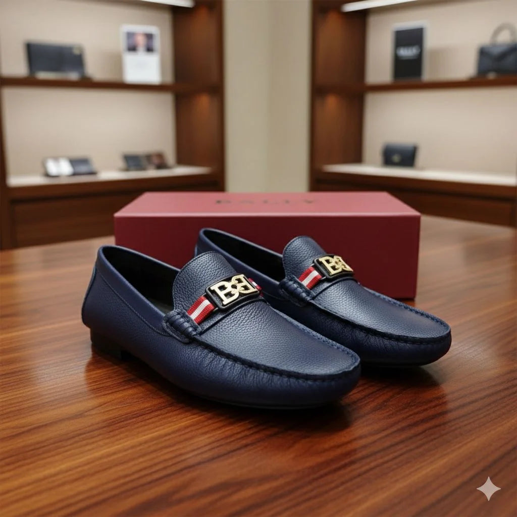 BALLY || Black/Blue Textured Calfskin Moccasins with B-Chain Hardware & Bally Stripe