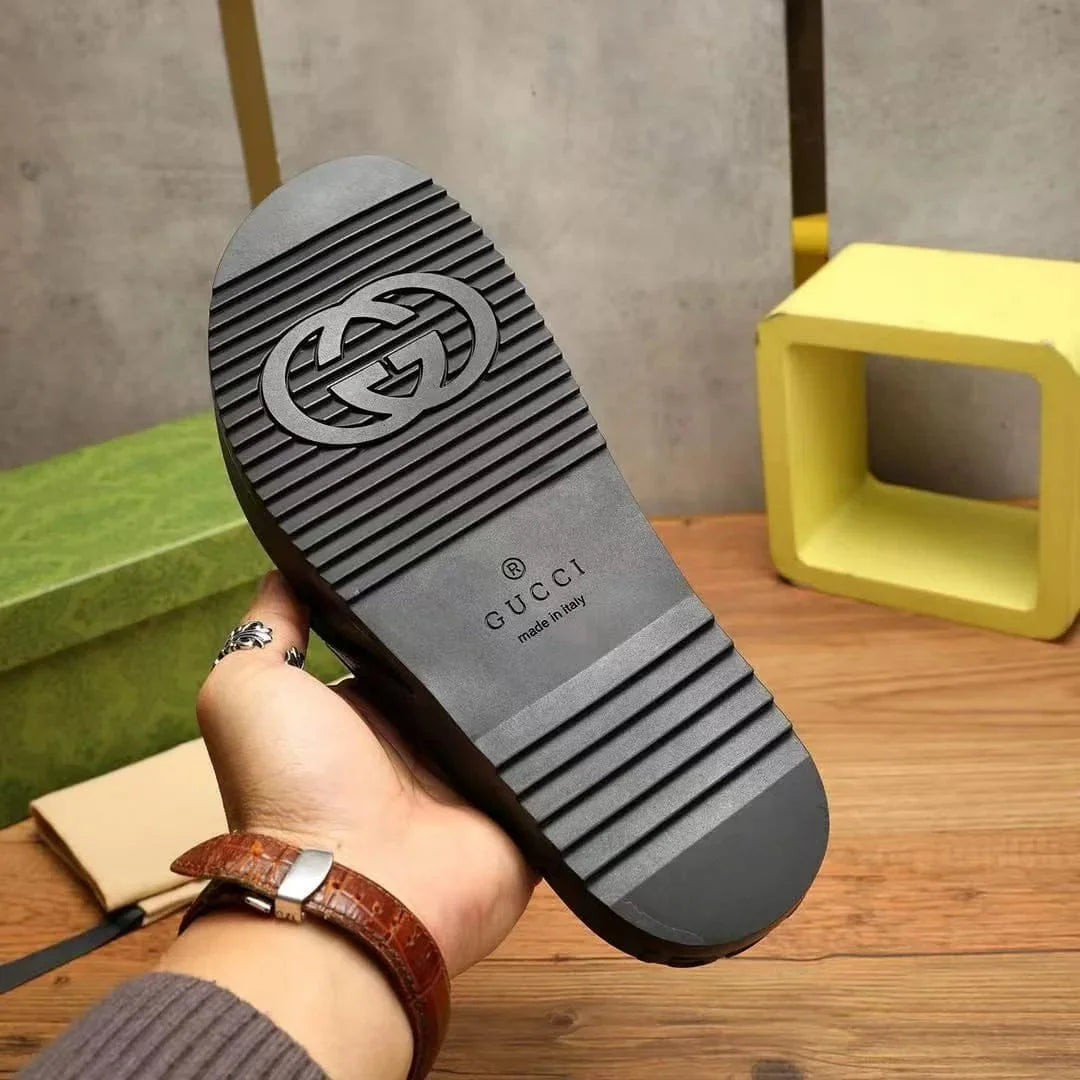 Step into bold sophistication with these Gucci Men's Web Stripe Leather Thong Sandals in classic black. Crafted from premium leather, these iconic sandals feature the signature red and green web stripe that defines the house's legendary aesthetic. The minimalist thong design delivers effortless style for warm-weather adventures, while the refined silhouette commands attention whether you're poolside or navigating the city streets. A fearless choice for those who refuse to compromise on luxury and attitude.