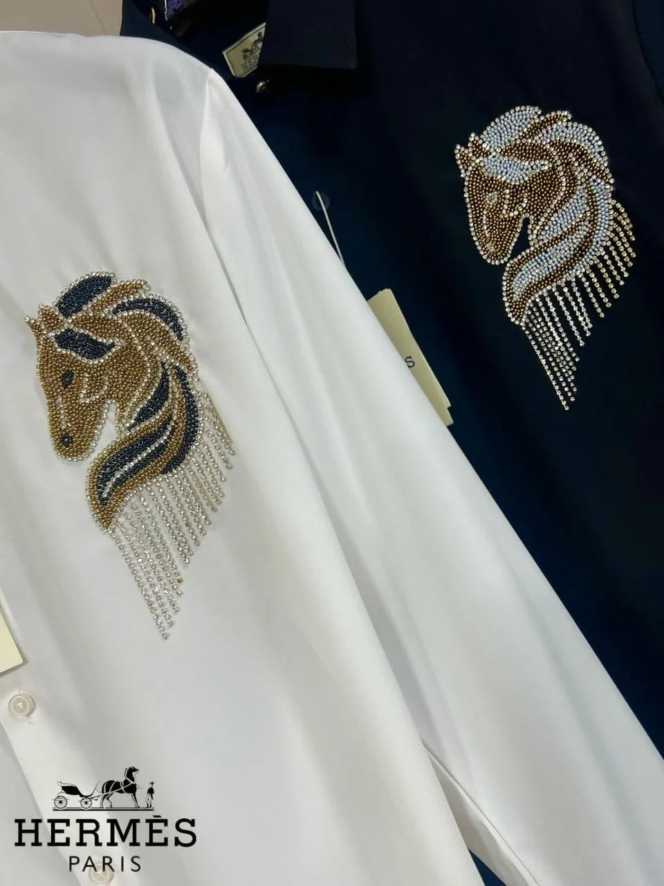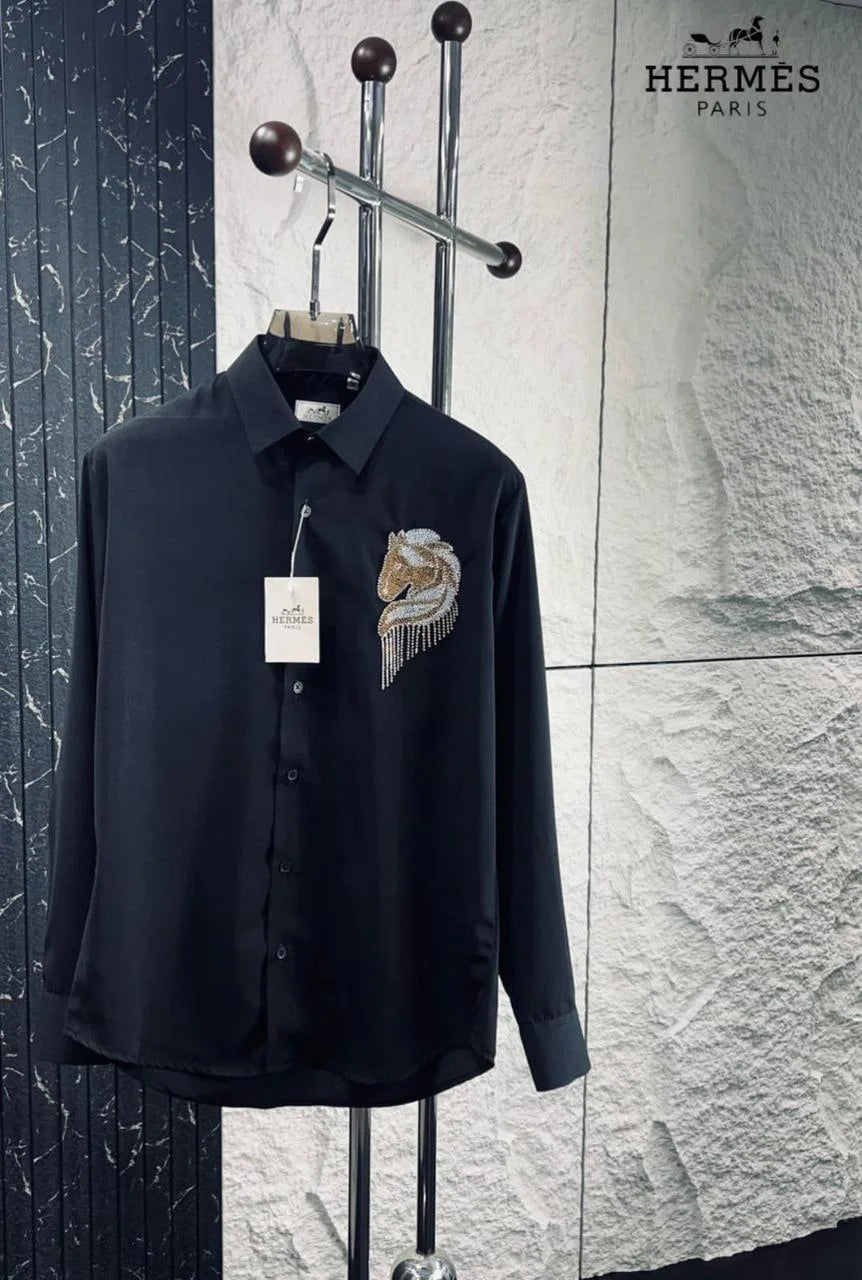 Unleash your daring spirit with the HERMES || Crystal-Embellished Horse Logo Shirt for Men. This bold statement piece features a crystal-embellished horse logo, adding a touch of adventure to your wardrobe. Made with high-quality material for comfort and style, this shirt is perfect for those who aren't afraid to take risks!