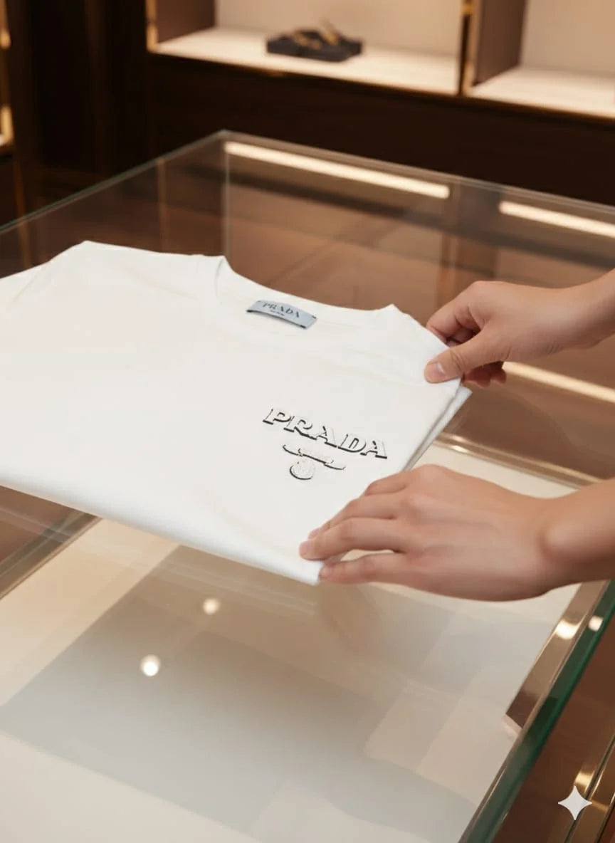 Elevate your everyday wardrobe with this sophisticated Prada Embossed Logo T-Shirt. Expertly crafted from premium, high-density cotton, this piece redefines casual luxury. The standout feature is the meticulously rendered 3D embossed Prada Milano logo on the chest, offering a tactile and modern twist on the classic branding.