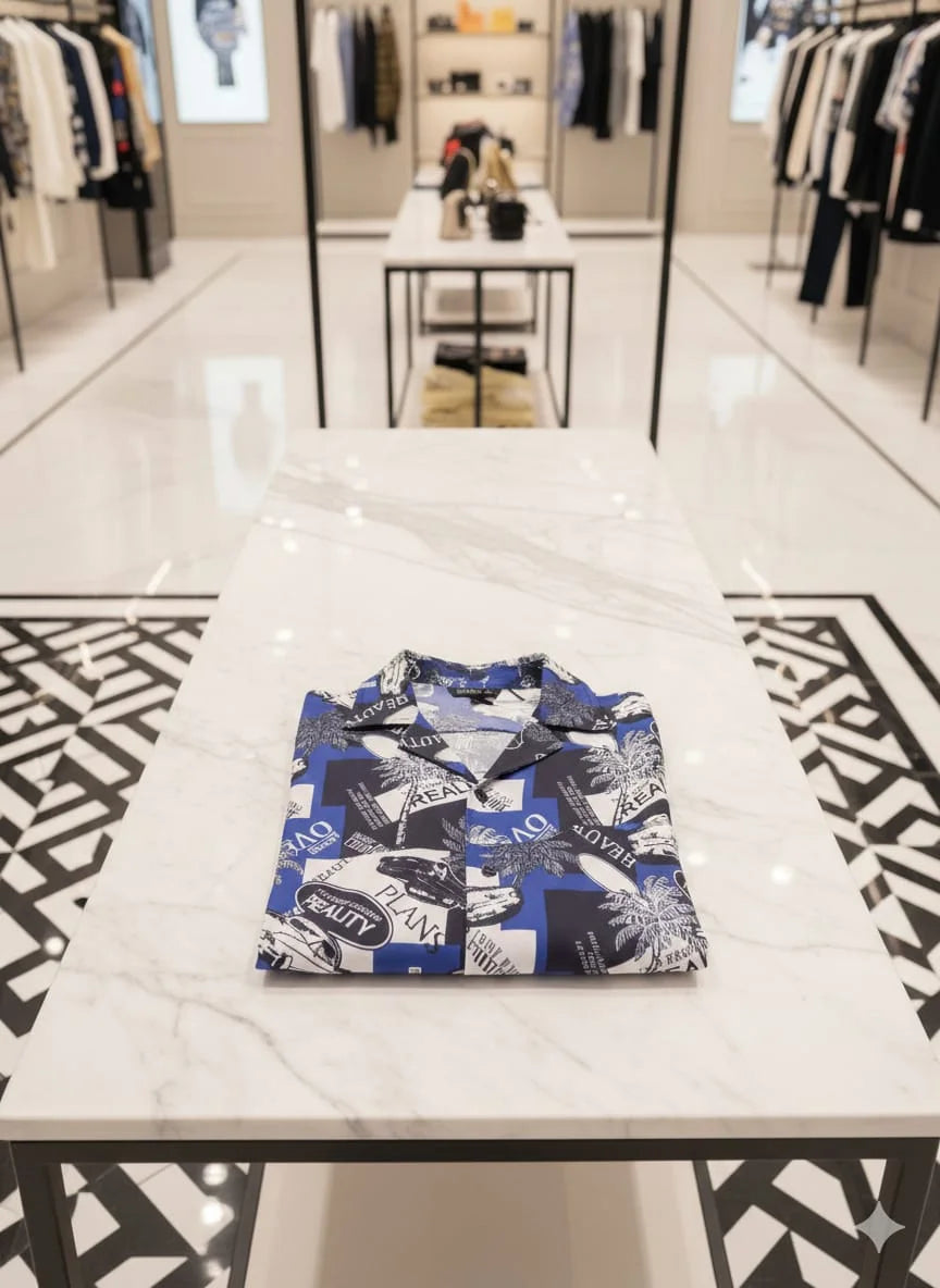 Elevate your luxury wardrobe with this stunning Versace Graphic Print Shirt. Featuring a bold, multi-dimensional collage design, this shirt blends iconic Mediterranean palm motifs with vintage automotive graphics and contemporary "REALITY" typography.